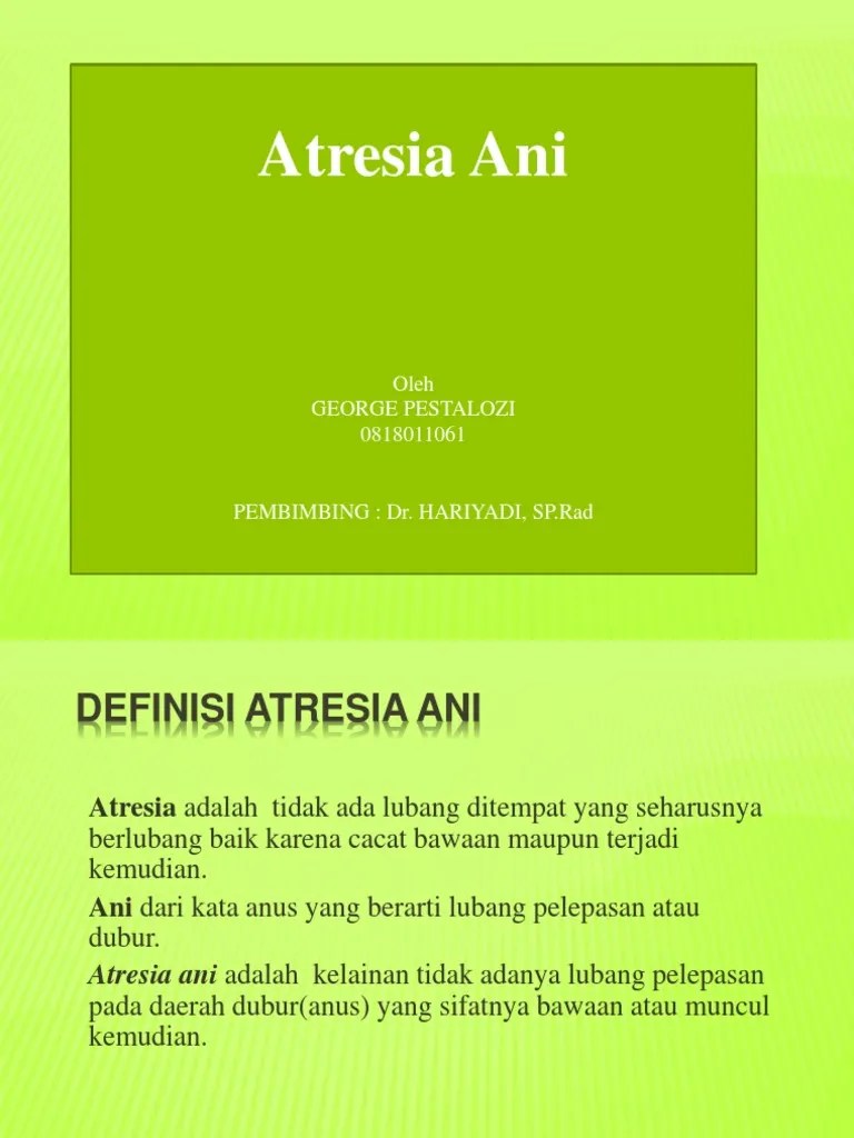 Penatalaksanaan anestesi pada koreksi atresia esophagus dan atresia. Program pendidikan profesi dokter hewan. Melansir dari ucsf benioff children's hospital, dalam beberapa kasus atresia ani, rektum bisa berpindah posisi hingga berada di dekat panggul maupun di . Kasus malformasi anorektal untuk lebih memahami perawatan pada pasien dengan malformasi anorektal. Keputusan untuk melakukan anoplasti pada masa .